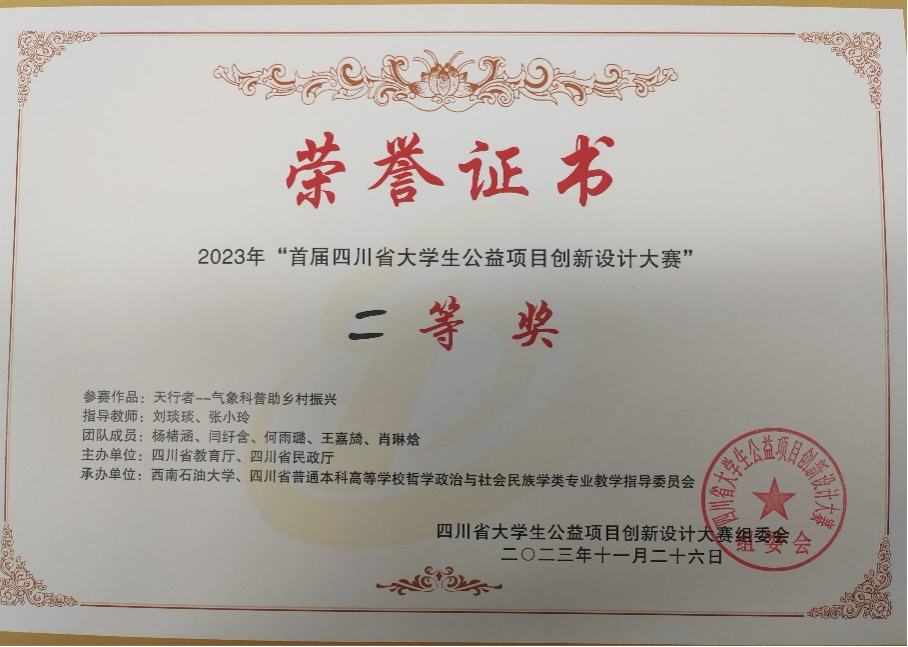 本科生与文化艺术学院研究生组成的“天行者”气象科技志愿者团队完成的“气象科普助乡村振兴”的作品,通过答辩评审荣获大赛二等奖。团队采用“气象科技志愿者+社会工作者”相结合的创新型公益服务模式,提出气象科普助力乡村振兴公益事业发展方案。