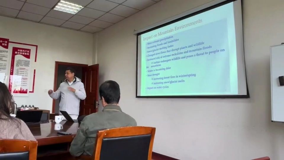 Deepak教授就气候变化背景下对山地环境影响等进行了口头报告。会后,文军教授、李茂善教授、赵勇教授等老师们和在场的研究生们与Deepak教授在野外观测设计、极端气候、大气污染和山地环境变化等方面的当前热点问题,进行了深入的探讨。