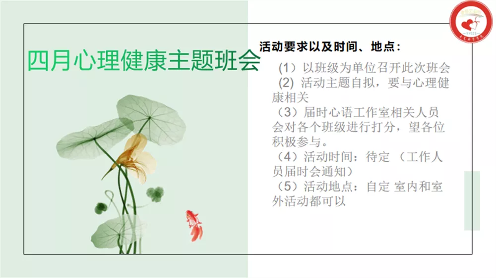 最后,心语工作室为各位心理委员宣布了新一轮“四月心理健康主题班会”的注意事项与要求,希望各班伴着春天的生气,同学们之间增进交流。