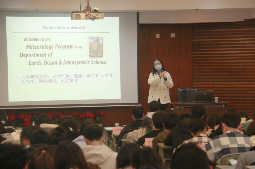 陈科艺为同学们讲解了北美洲的大气科学,通过分享往届学生出国留学的经验,为同学们讲述了美国和加拿大名校的大气科学的主要研究方向,并对如何选取导师给出了建议。她鼓励同学们不断开拓自己的眼界,丰富自己的阅历。