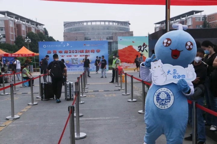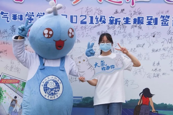 吉祥物“云宝”、沿途悬挂了指路牌、天气小标识、气球,签名板,只为给新同学进校第一天留下美好的回忆。