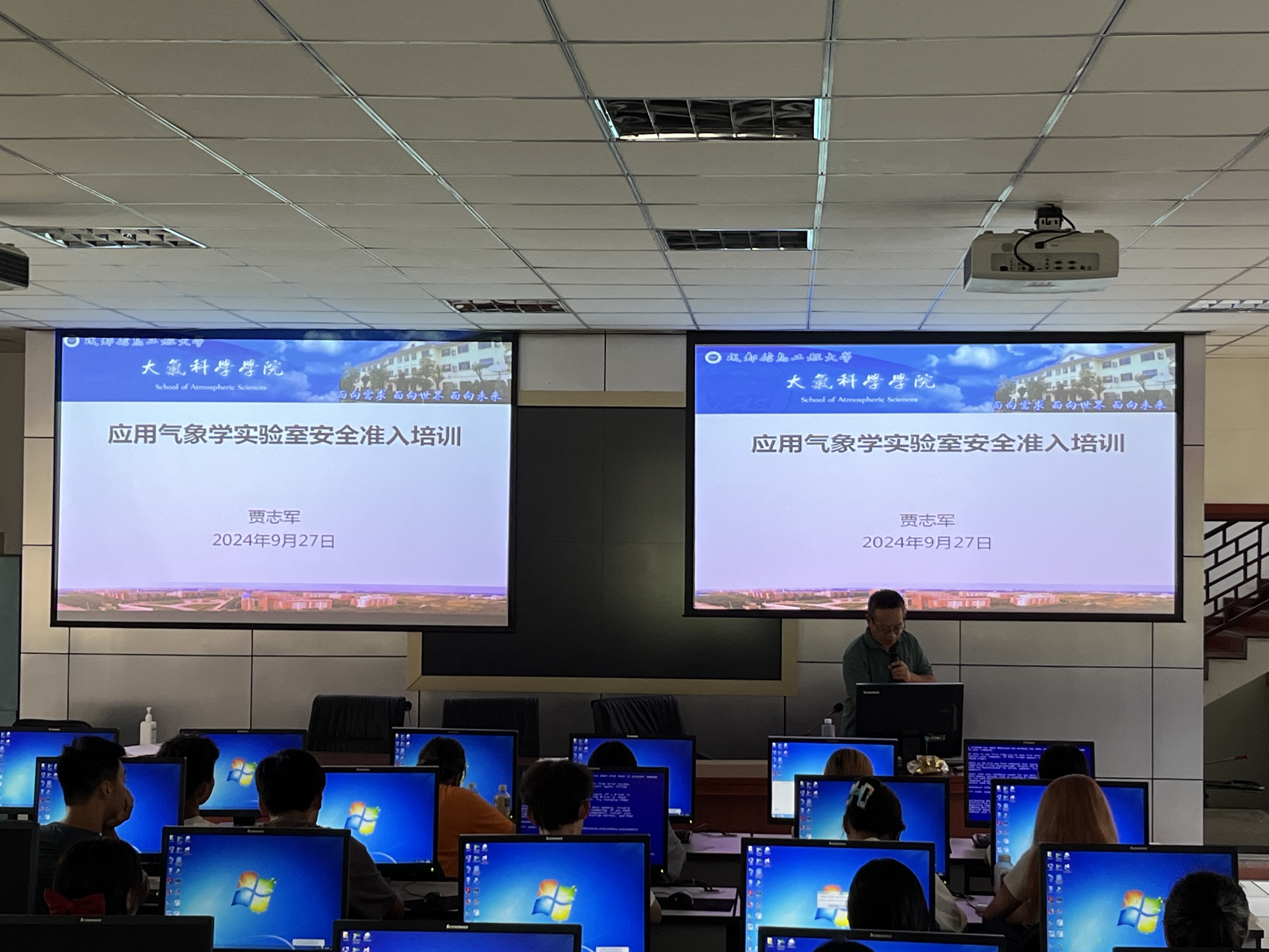 应用气象学实验室贾志军老师主要介绍了应用气象学实验室的基本情况,并重点强调了在实验室如果遇到火灾和人员触电突发事件,应该采取的应急预案和基本处理流程。