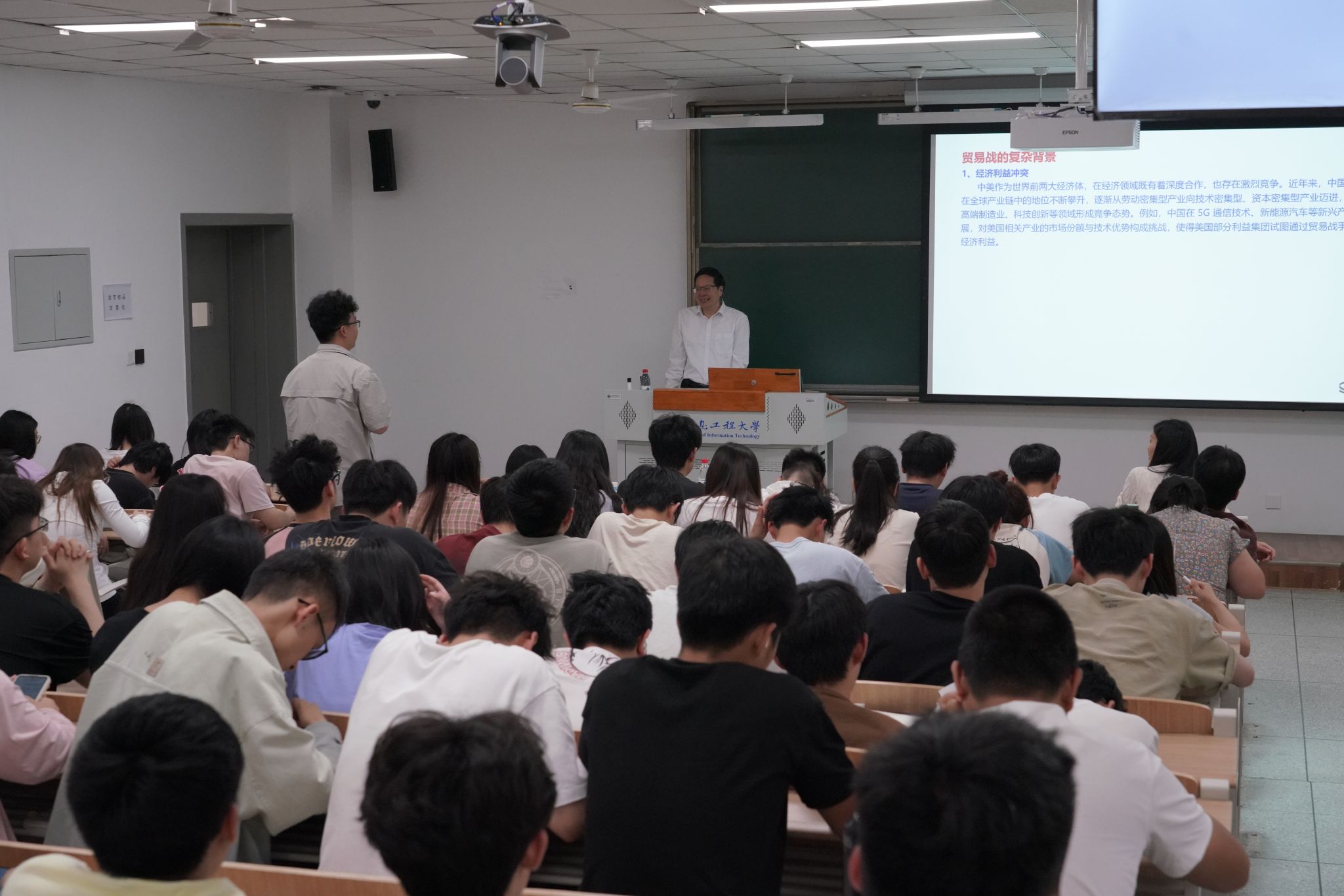 沈火明指出,贸易战与科技竞争不仅影响双边经济,还对全球格局产生深远影响。针对当前局势,沈火明希望两国关系沿着正确航向前进,呼吁学生们客观全面地认识中美贸易战背后的深层次原因和发展趋势,理性分析国际关系问题,并鼓励学生们努力提升专业知识与综合能力,为推动中美合作共赢贡献智慧与力量。