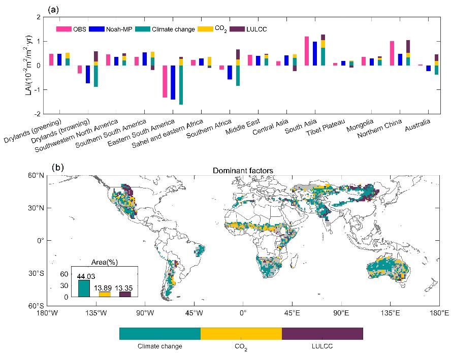 陆面过程与大气边界层研究团队成员蹇东南博士联合美国亚利桑那大学、中国科学院大气物理研究所、北京大学和清华大学的专家学者,利用考虑根系动态吸水过程的Noah-MP陆面模式,量化了气候变化、CO2和土地利用/土地覆盖变化对全球干旱半干旱区植被变化(由叶面积指数表征,LAI)的贡献,论文以题为“Limited driving of elevated CO2 on vegetation greening over global drylands”发表在Environmental Research Letters杂志上。