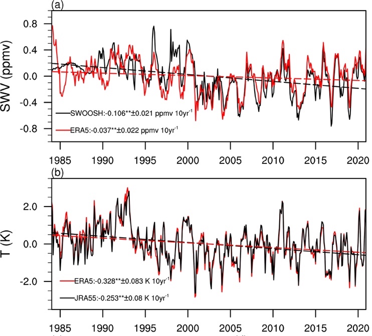 观测中热带(30°S-30°N)平流层水汽和对流层顶温度的异常变化趋势