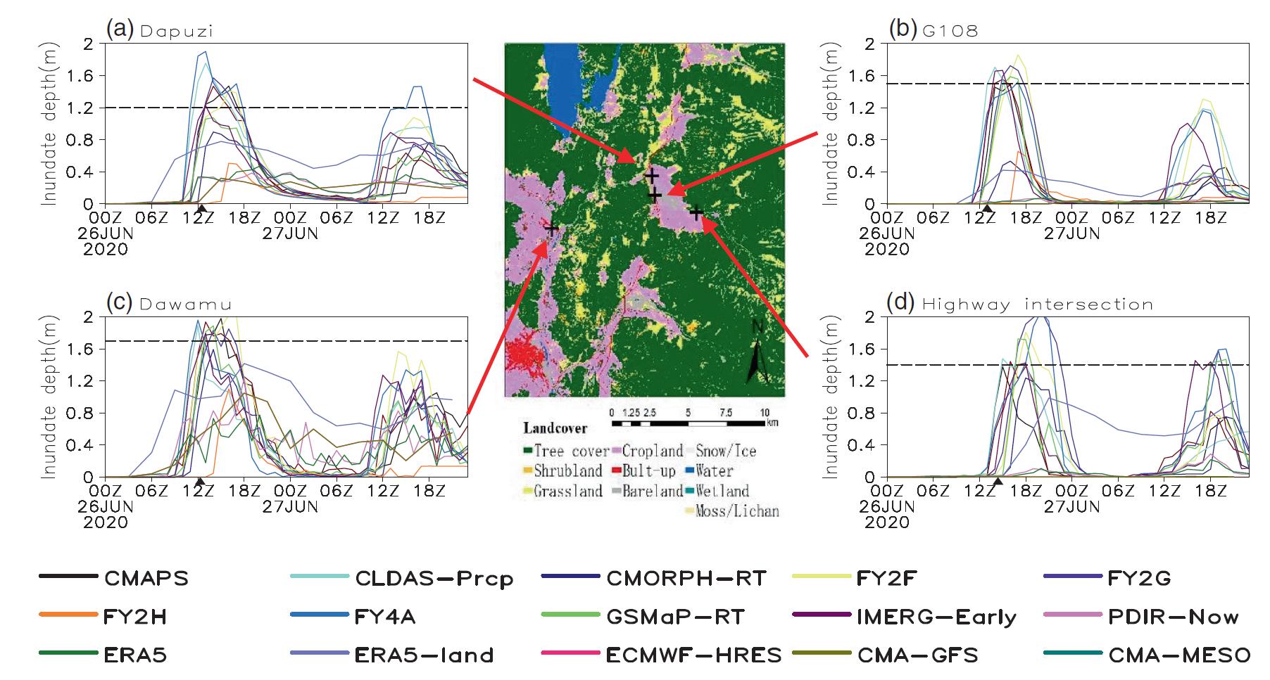 Fig.6Evolution of the flood inundate depth via the hydrodynamic simulation with variant precipitation products at the occurrence location of mountain torrents of: (a) Dapuzi village, (b) Incident location at the national road of G108, (c) Dawamu village, and (d) High-way intersection. The dashed line and the triangle denote the maximum inundate depth and the reported time of the mountain torrents by the post-disaster survey, respectively. The center graph (shaded) indicates the landcover in the region where the mountain torrents occurred.
