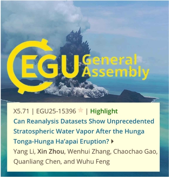 关于汤加火山喷发后平流层水汽变化的研究成果,入选2025年年会亮点研究“EGU highlight”,是EGU25 Volcano-climate impacts and the stratospheric aerosol layer专题唯一入选亮点研究的成果。