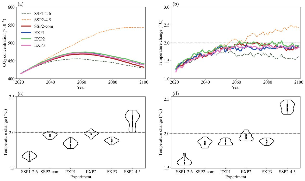 作者文章|图2(a)全球大气CO2浓度的变化趋势;(b)全球平均地表温度相对于1850–1900年基准期的温升;(c)中期(2061–2080年)全球平均地表温度变化分布;(d)长期(2081–2100年)全球平均地表温度变化分布。(EXP1、EXP2、EXP3分别表示仅CO2减排、CO2和SO2协同减排以及CO2和BC协同减排三个敏感性实验。在小提琴图中,白点表示平均值,粗黑条表示四分位区间,细黑线表示完整范围)