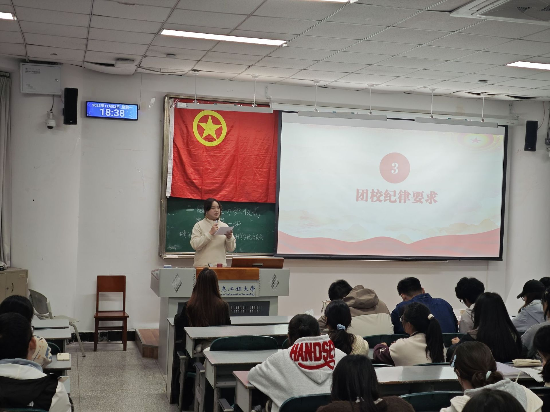 随后,学院团委副书记杨蕊菡宣读了本期二级团校的纪律要求与学习制度。她详细说明了考勤办法、课堂纪律与考核标准,明确要求全体学员须严格遵守学习纪律,以饱满的热情和认真的态度完成各项培训任务。