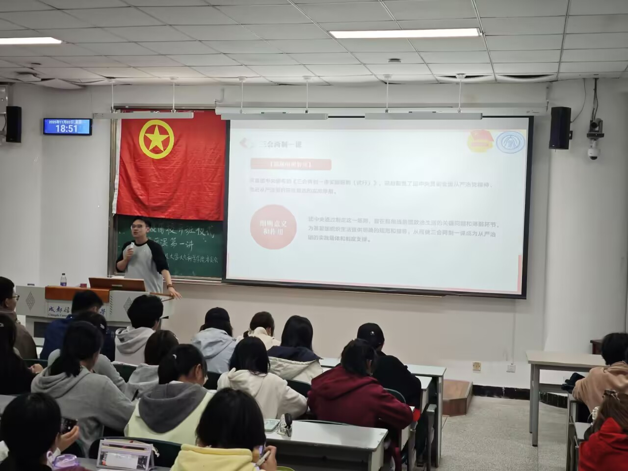 开班仪式结束后,张泽昊老师为学员们上了本次团校的第一堂课。他围绕基础团务知识与团支部工作实务展开系统讲解,重点涵盖团支委工作职责、“三会两制一课”、发展团员工作细则等制度规范,以及团旗、团徽和团歌的规范使用、组织生活开展、评优推优等基础团务实操内容。最后,他勉励全体学员要珍惜学习机会,夯实业务基础,坚定理想信念,将个人成长自觉融入党和国家事业发展进程。