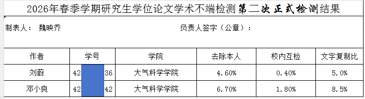 2026年春季学期研究生学位论文学术不端检测第二次检测结果(非全)