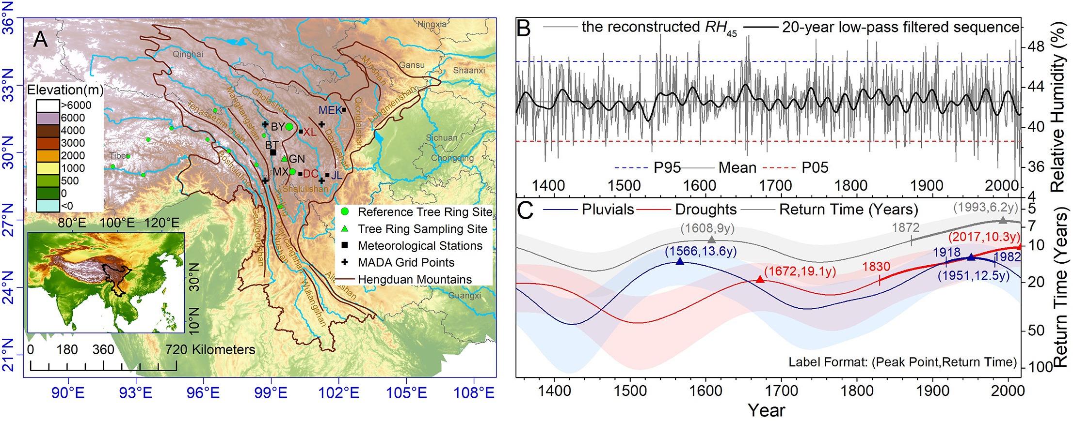 树轮采样点信息(A)、重建1349-2017年相对湿度变化(B)以及极端降雨事件(蓝线)、干旱事件(红线)和所有干、湿极端事件(灰线)的重现期及相应的置信区间(C)(图片摘自Cui et al., 2024)