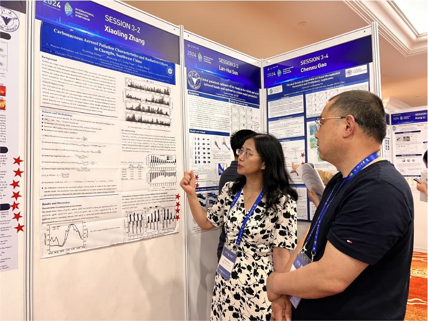 张小玲教授、李扬副教授、和周欣副教授应邀参加此次会议,并开展学术交流。张小玲教授在Session3: ParticalRadiative Properties分会场作题为“Carbonaceous Aerosol Pollution Characteristics and Radiation Effects in Chengdu, Southwest China”的墙报展示(图1);周欣副教授在Session 7: Wether, Climate and Enviroment Applications分会场作题为“Atmospheric and Near-term Climate Impacts of the 2022 Hunga Tonga-Hunga Ha’apai Water-rich Plume”的学术报告(图2);李扬副教授在此分会场作题为“The Impact of El Niño–Southern Oscillation on the Total Column Ozone over theTibetan Plateau”的墙报展示(图3),并与国内外同行进行了热烈的讨论与交流。