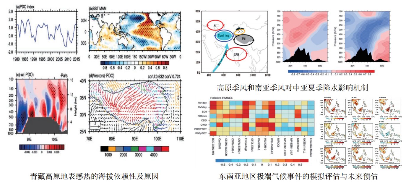 3.科研成果 学院在国家重点研发计划项目、国家自然科学基金重大研究计划项目、国家自然科学基金重点项目等一系列国家级和省部级高层次科研项目的支持下,长期围绕气候与气候变化、高原气象、大气物理与大气环境和气象防灾减灾等方向开展特色研究,年均发表高水平论文200篇以上,科研经费年均到账2300万元,近五年获得省部级科技进步奖7项。 气候与气候变化方面,关注服务“一带一路”的青藏高原及其周边地区天气-气候变化研究。青藏高原地表风速和地气温差是影响高原地表感热随海拔变化的主要因素。高原高海拔地区日照时数和积雪深度可引起地气温差的变化,进而导致地表感热随海拔高度的改变。当高原季风偏强和南亚季风偏弱时,对应中亚对流层中高层气温偏低,中亚上空受异常气旋控制,导致更多的夏季降水发生。东南亚地区极端气候事件的强度和频率在2°C增暖阈值下要明显高于1.5°C,局地性的极端降水事件在高排放情景下的发生时期会更加集中。